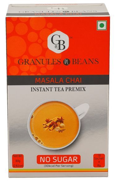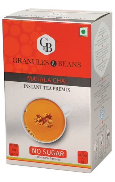 Granules n Beans Masala - No sugar especially made for people who are sugar conscious. Its helps in diabetes as well as weight loss management. It is a carefully crafted blend of milk, Assam tea extracts and a whole array of spices like, cardamom , ginger, clove, cinnamon, nutmeg and black pepper. Every spice has its own individual health benefits and works in synergy. Our proprietary encapsulation technology releases the flavours only when it comes in contact with hot water. The high solubility of the ingredients ensures a consistent & balanced taste and unique flavour. It works like a stress buster and gives you a touch of warm, smooth energizing feeling. Just CUT. STIR. SIP and enjoy a refreshing cup of instant tea.