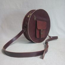 This Bag is made of pure camel leather with handmade embroidery (Kashidakari). and is available in 2.5", 3.5", 4" and 5" diameter. It can be used to carrycontain things Size - width is 11" and diameter is 5"