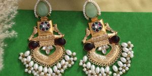 Pista Green Maroon Color Handmade Brass Metal Natural Stones Kundan Earring