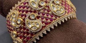 Featuring an antique gold finish bracelet studded with kundan polki and ruby stones, set in brass. Perfect wear for any festive occasion or wedding ceremony.
