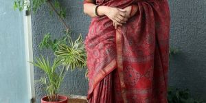 Red Ajrakh Hand Block Printed Chanderi Cotton Silk Saree
