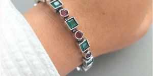 This festive season, embrace the elegance of tradition with this striking silver-toned bracelet, beautifully adorned with green and magenta pink stones. The alternating square and round stones create a vibrant contrast, making this piece an eye-catching addition to any festive ensemble.