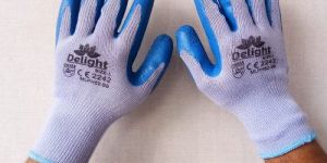 Blue latex coated hand gloves.
