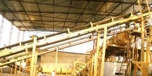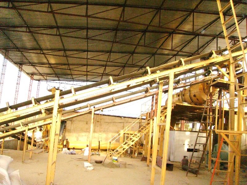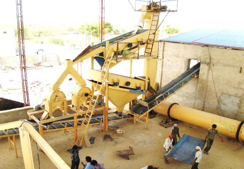 The Mineral Gypsum or Phosphors Gypsum is Screened for lumps. The lumps are crushed fine. The powder is mixed with the binder and hardener and transferred to the granulator. In the granulation drum a very fine spray of water is done on rolling material at its angle of repose. Some coating of powder over the small nuclei / particles takes place. The size of granules are controlled as More spray, bigger granule. Less spray small granule. This duration of this process is controlled as per requirement. The material is then taken to dryer drum where the hot air generated in the furnace is passed through it. The dried material is cooled in cooler drum by passing ambient air through it . The ID fans connected to dryer & cooler sucks air from the drums so some dust also comes with it. The dust is separated in the cyclones and finally scrubbed in wet scrubber. The cooled material is screened through under size & over size screens. The product of 1 – 4 mm size is separated and packed in 50 kg. bags. The oversize material after crushing and the under size are recycled and work as nucleus for next cycle .