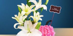 The Beautiful Floral arrangement. It consists of elegant White lilies with green buds and long stems, paired with a vibrant pink roses. The flowers are arranged are arranged in a stylish black rectangular box, adorned with a white ribbon and a small white flower as a decorative accent. A small sign that reads “Happy Anniversary” is placed within the arrangement, making it a perfect gift for anniversaries, celebrations, & special occasions or as a thoughtful gift for loved ones.