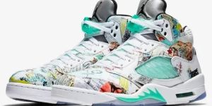 Supplied by a premier sneaker marketplace dealing with unworn, already sold out, in demand rarities. Each product is rigorously inspected by experienced experts guaranteeing authenticity. These are the only wings it takes to fly. Crafted from multicoloured leather, the Air Jordan 5 Retro wings from Jordan are finished with all-over graphic prints to have you soaring. Take off and fly high. Featuring a round toe, a lace-up front fastening, a logo patch at the tongue and a rubber sole.
