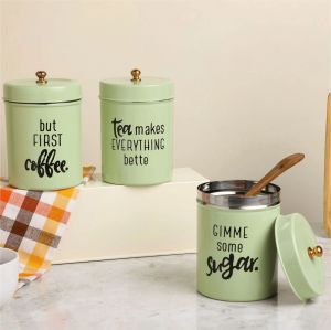 Share your heartfelt secrets over coffee and Tea and store them in Dudki\\\'s ravishing Stainless steel Metal Canisters. A set of 3 metal jars to keep Tea, coffee, sugar, or anything you want. If you have been waiting to change the look of your kitchen and style your shelves with something quirky yet elegant. The vintage design combined with perky quotes is a perfect example of aesthetically pleasing.\r\nIn addition, this airtight canister set of 3 jars has a lovely glossy finish, so things will never be dull. We value our customers the most, and that\\\'s why these jars are made with the finest quality Steel. With the chic look combined with easy-to-use making, our Canister set will be the best purchase you make for your kitchen. It can also make a perfect gift for your loved ones.\r\nDurable: The airtight finish of our Stainless steel Canisters will help keep the bacteria out and minimize the chances of molds growing in stored items. Even with dry items like lentils and dry fruits, it is best to prevent them from moisture.\r\nCharming finish: Our Designer Canisters are made with keeping elegance and practical use in mind. That\\\'s the reason we get it right each time. The glossy finish on stainless steel gives your kitchen a fabulous look. So get them for yourself and your loved ones to surprise them with the best.\r\nBrass Knob: Dudki\\\'s Stainless Steel Canisters Set of 3 has a unique brass knob on its lid to give them an antique finish. They are secured with brass screws from the inside to provide double strength and support.\r\nAirtight Containers: Each of these airtight containers has a different print but still compliments each other perfectly. This food storage unit is perfect for your kitchen, restaurants, bistros, pubs, cafes, pantry, and so on.\r\nInspiring Quote: Our designer Multi-purpose Stainless Steel Canister set comes in 4 different color options Light Pink, Ivory, Pista Green, and Aqua, so that you can get the perfect look for your kitchen.\r\nPerfect for you: Dudki\\\'s Canister set of 3 jars is designed especially so that it works and fits with full-size measuring scoops. It is Dishwasher safe. However, we recommend washing from hands to keep the product as good as new.