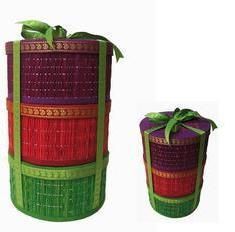 Serves as multipurpose container set. Easy to carry and is resuable. Could be used to fill Thamboolam items and Bakshanam items too. A different gift for your guests !