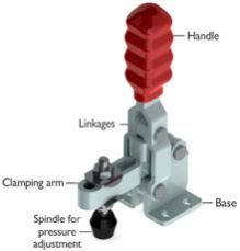 Toggle clamp is a simple Mechanism which holds instantly. The Toggle Clamps Consist of a handle to operate, a Clamping Arm to Reach the work piece, linkages for multiplying the applied force, and a base for mounting at the workplace on it’s base. The handle is operated which thereby moves the clamping arm to hold the work piece. A required clamping force is achieved and exerted on the work piece. Under this action the Toggle Clamp Holds the work piece firmly and positively.