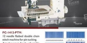 12 needle flatbed double chain stitch machine for pin tucking. Attachment is freely adjustable in various sewing styling of left or right side folding assort with manifold cloth-leading device, for example, shirt, one-piece dress, children's shirt, etc.