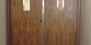 door frame : wooden door frame made of hard wood /teak wood of section 145mm x 70mm with heat activated intumescent fire seal strip of section 10mm x 4mm and one coat of fire & anti-termite primer. door shutter : 55mm thick asbestos free composite fire / smoke check wooden shutters of 120 minutes fire resistance rating confirming to bs : 476 part – 22 & is : 3614 part -ii comprising of two 12mm thick calcium silicate boards sandwiching 25mm thick proprietory fire resistance insulation material faced with 3mm commercial ply on both side with heat activated intumecent fire seal strip of size 15mm x 4mm mounted on grooves on three sides except bottom and one coat of anti-termite fire retardent primer.