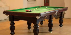 One standard size 8ftx4ft Exclusive Design Pool Table made in wooden construction frame, pure shesham solid wood legs with 3 Indian Slates of 38mm (1-1/2") thickness, hard wood cushion material with melien rubber cushion fitted on table cushion top, professional cloth, glossy & cherry color combination table. One set of pocket (1 set contain 6pcs), standard size Pocket cutting, with nut adjuster.