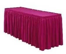 We are manufacturing and exporting this great variety of table skirts that provide your table a professional appearance at low cost. This table skirt has a capability of covering your table quickly and efficiently. This table skirt adds style to the display, at the same time it also covers up unattractive display tables underneath. specificationsred violet coloredstylish pleats ideal forpartiesmarriages