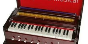 Harmonium double reeds, 3 12 octaves, 9 stops, 4 extra notes, multifold bellows, PRIYANKA MUSICALS special reeds, organ tune, shaped full cover, brass nickeled knobs, with glass frame on keys, and double back valve. portable, with SPL numbered locks.