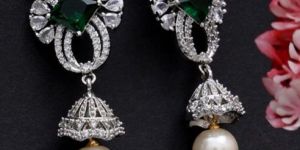 Green Cubic Zirconia and American Diamond Studded Jhumki Earrings