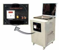 COLD THERAPY UNIT : Made out of heavy gauge stainless steel sheet. Tank is fully insulated in between top and sides. Size of tank is 30 x 45 x35 cm. Fitted with heavy-duty cooling unit and thermostat for temperature control. A drain valve is provided for emptying. Mounted on 3" sizes ball bearing rubber castors for easily mobility. Comes with 6 standard packs, (Size 10" x 12"). Containing special silica gel crystals. Finished bright inside and special paint outside