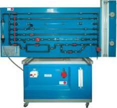 Pipe Friction Bench Technical Description The test stand for investigating losses in pipes is a complete, closed experimental set-up. Due to the installation of the set-up on a laboratory trolley and the closed water circuit with supply tank and pump, the test stand is flexible in use. Eight different pipe sections are provided for the investigations, these are equipped with annular chambers with measuring connections for pressure measurements. The pipes can be individually selected for the investigations using ball-cocks. Double tube manometers are provided for pressure measurements along with a battery-operated electronic differential pressure gauge. The flow rate is indicated on a variable-area flow meter. An instruction manual with detailed description of the theoretical background is supplied.