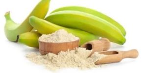 Spray-dried raw banana powder is a fine, light powder made from green (unripe) bananas that have been carefully dried using a spray-drying process. In this process, raw bananas are first pureed and then sprayed into a hot air chamber, where the moisture is rapidly evaporated, leaving behind a fine powder. This method preserves the raw banana's natural nutrients, flavor, and color while providing a shelf-stable product that retains many of the health benefits of fresh bananas.