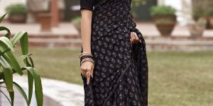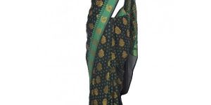This traditionall saree is perfect for a special occassion ! Black summer silk fabric base. Bootas all over saree .Gold Zari woven details. Contrast color design. Unstitched blouse fabric is attached with the saree. Contrast Fuscia Pink silk borders. Fabric- Silk
