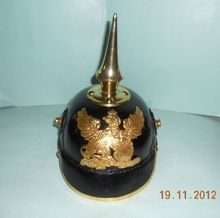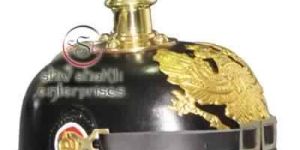 Leather pickelhaube helmet with Brass FR Eagle Badge. It is Handmade as a original one with a leather skull, german brass rivet and edgings, it has adjustable Belt, the front badge is a beautifully hand crafted eagle in brass, the originals of the helmets are rarely found and way too expensive, it is one of the best copies of the german leather helmet.