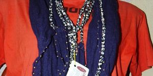 We are offering ladies fancy scarves made in viscose fabric scarves length 18050 and joint 3 mtrs wood beads molded necklace, navy colour weight 130 grm.