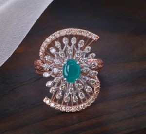 Channel timeless elegance with this Art Deco-inspired ring featuring a Precious verdant emerald centerpiece surrounded by an intricate fan-shaped diamond array. This classic design brilliantly combines vintage charm with contemporary craftsmanship in 14K rose gold.Product Specifications:• Metal: 14K Rose Gold (Hallmarked)• Gross Weight: 6.52 grams• Net Gold Weight: 6.279 grams• Diamond Details: 60 pieces, Total Weight 1.00 carat• Center Stone: Natural Green Emerald• Setting Style: Art Deco Fan Pattern• Collection: ClassicThe symmetrical fan-shaped diamond arrangement creates a stunning frame for the emerald centerpiece, making this ring perfect for both special occasions and elegant everyday wear. A testament to timeless design and superior craftsmanship.