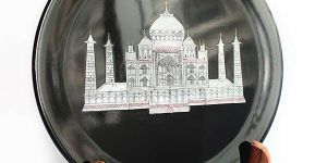 we are offering black marble plate - taj inlay design. uniquely showcasing the eternal pride of india, taj mahal, this white marble decorative plate serves as a perfect gift item for someone you admire and love size - 7'' dia (inches)