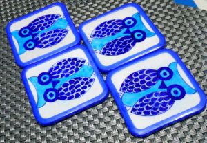 We offer blue pottery coaster set . Handmade jaipur blue pottery coaster set of 4 pieces. Each piece has a rubber casing for chip resistance and a scratch free surface.