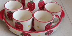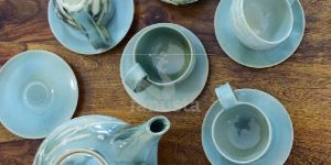 Indulge in the beauty of simplicity with this glazed ceramic tea set, adding a contemporary touch with the subtleness of its earthy tones. The tea pot embarks a great Chinese cultural value of bringing in prosperity and oneness through the versatility of tea for one and all. The asymmetrical patterns and colour variations of the greens shows the transitions in the life journey of a leaf in its natural way. Make this 13 piece handmade tea set a part of your routine or use it for festive get-together not only for its purpose of serving but also for its authentic appeal. WeightCup- .212 (6 piece)Saucer plate- .196 (6 piece)Kettle- 1.484 (1 piece)DimensionsKettle : 28 X 28 X 13 CmCup Each: 11 X 11 X 5.5 CmSaucer plate Each: 14 X 14 X 2 Cm