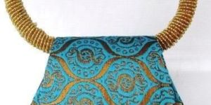 Product Description    A unique clutch in rich banarasi fabric foam mounted on sturdy plastic body. A strong button magnet ensures that the flap stays intact always. The beaded handle and the metal accessory add to the beauty of the product
