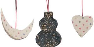 These charming hanging ornaments are crafted from eco-friendly handmade paper, shaped into a crescent moon, a traditional gourd, and a heart. Each piece is decorated with dotted motifs—subtle polka dots on the white crescent and heart, and firework-like bursts on the dark gourd shape. Lightweight and suspended by red threads, they make for delightful decorative accents suitable for festive decor, children’s rooms, or as eco-conscious holiday ornaments.