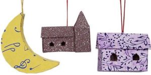 These charming hanging ornaments are made from eco-friendly paper mâché, skillfully handcrafted and painted in vibrant hues. The set features a crescent moon with whimsical blue accents, a rustic glittered chapel with twin window cutouts, and a lavender-toned house adorned with floral motifs. Lightweight and suspended by decorative strings, they’re perfect for seasonal décor, festive trees, or adding a touch of folk artistry to any space. Each piece reflects unique craftsmanship, blending traditional techniques with playful design.