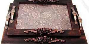 Product Description      These trays are made of MDF and polished in dark brown copper metallic finish. The trays are sturdy and of great finish. Additions of handles, flower decoratives and glass greatly enhance the look of the product