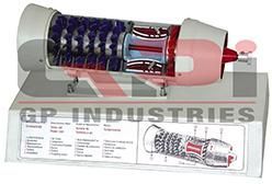The section cut model is constructed of light and strong metal showing air intake, axial flow, double stage compressor, fuel supply, combustion chamber, turbine rotar, jet thrust, exhaust etc. Complete on base, with printed diagram showing working.