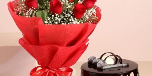 Fall in love with this classic bouquet of red roses wrapped in red paper. Sprinkled with baby breath, this love-infused bunch looks simply magical. Let your special someone know how much you love them with the help of this spellbinding bouquet. The heavenly taste of the chocolate cream cake will elevate the experience of joy.