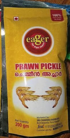 Eager Prawn Pickle is a tasty side dish contains prawns,ginger,garlic,green chilly,red chilly powder,edible oil, salt,mustard,fenugreek turmeric powder,spices,synthetic vinegar.