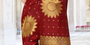 Designer collection beautiful handloom Kanchipuram Samudrika pattu silk saree in maroon colour with designer big sunflower motifs in zari work with buttas all over . Designer rich pallu and on border. This saree is done with pure jari.