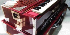 9 scale 3 sets reed portable harmonium, made of seasoned burma teak wood, italian nylon keys, and italian celluloid, machine gloss finish polish, 440hz tune with heavy padded water proof cary bag.
