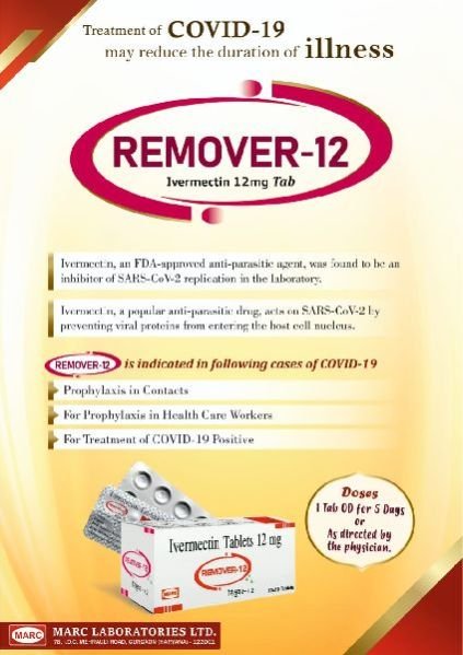 REMOVER-12 is a treatment of COVID-19. It may reduce the duration of illness. Ivermectin, an FDA approved anti-parasitic agent, was found to be an inhibitor of SARS-CoV-2 replication in the laboratory. Ivermectin, a popular anti-parasitic agent, acts on SARS-CoV-2 by preventing viral proteins from entering the host cell nucleus. Composition of REMOVER-12 : Ivermectin 12 mgIndications :