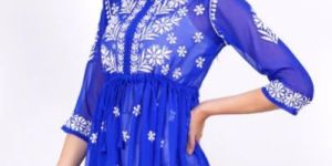 Introducing "Sufiza's" Blue Georgette Peplum Top, embellished with delicate Lucknowi Chikankari white thread embroidery, exuding timeless elegance.