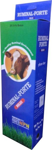 • We offer a wide range of Ruminal Forte Bolus which is a Key to Healthy Ruminal Environment. The Ruminal Forte Bolus offered by us is highly efficient in swiftly correcting ruminal ecology to overcome anorexia, ruminal, Atony Abnormal faeces, Diarrhoea, and Acidiosis. Scientifically selected ingredients of Ruminal Forte used in our Ruminal Forte Bolus, ensures quick recovery of animals from diseases. Effective During Variabillity in quality and quantity of feed like Indigestible roughage (mouldy, over heated or frosy feed.) Over feeding of concentrate or greens Feeding of antibiotics with feed Sudden Change to new source of feed Stress : Transportation, Productions, Disease, Climate Antibiotic therapy Change in Rumen ecology leads to : Impaction Anorexia Ruminal Atony Abnormal faeces Diarrhoea Acidiosis Dosage 8 bolus Dissolved in Luke warm milk (250-500ml) with sugar or gur-after half hour culture should be supplemented repeat after 12 hrs if necessary Composition Each 5 Gm Bolus Contains Live yeast cells of a proprietay strain of saccharomyces cerevisiae 25 billion (25x109) cells per bolus Blend of Live Lactobacillus, Amino Acids, Liver Extract, Fungal Diastase, Sea Weed Extract Aspergillus Oryzae, Charaita, Cobalt, Pepsin