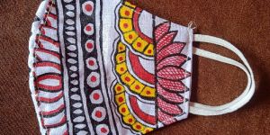 Reusable cotton handmade mask with an exclussive handprint madhubani art created on it.White elastic ear loops used for comfort purpose.