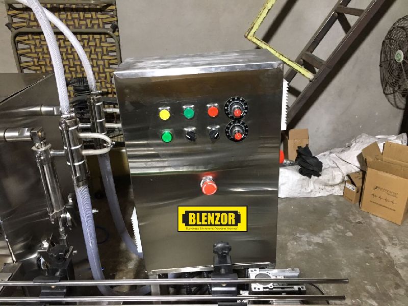automatic volumetric liquid bottle filling machine work on volumetric principle with diving nozzles. The unit is made compact, versatile & enclosed in stainless steel elegantly matt finished body, consist of s.s. Salt conveyor, reciprocating nozzle with self centering devices & s.s. Syringe. No container no filling system arrangement is standard features of the machine. the main drive of the machine and conveyor drives consist of a/c motor with a/c frequency drive.