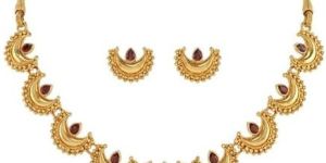 This exquisite Traditional Antique Gold Plated Chandbali Necklace Set brings together timeless Indian craftsmanship and contemporary elegance. Featuring a stunning crescent moon design adorned with deep red cubic zirconia stones, this jewellery set captures the essence of heritage beauty. The necklace showcases intricate Rava work with minute gold granulation detailing that adds luxurious texture and depth to each crescent motif. Designed to sit gracefully as a choker-style piece, it features an adjustable dori closure ranging from 30 to 45 centimetres, ensuring a perfect fit for various necklines. The set includes matching stud earrings with secure push-back closures that mirror the necklace's elegant design. Ideal for weddings, festivals, engagements, and special celebrations, this lightweight set pairs beautifully with sarees, lehengas, and fusion wear. The matte antique gold finish gives it a sophisticated, heirloom appearance that complements both traditional and modern outfits. Each piece is carefully crafted to be comfortable for extended wear whilst making a statement of refined taste and cultural pride.