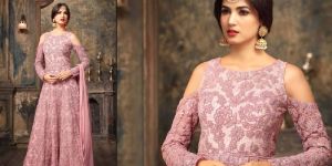 Elegant designer long net anarkali suit with beautiful Embroidery work, zari work alongwith santoon inner & bottom.Combined with matching chiffon dupatta with lace. We make outfits upto size 36 to 42 & can be customized. As well as standard stitching is possible. Suits can be customized with any changes if you want for unstitched products(Slight variation in color & patch border is possible).
