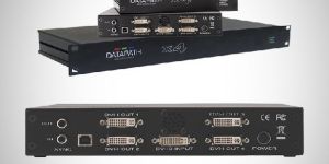 The Datapath x4 is a stand alone display wall controller that accepts a standard single or dual-link DVI input and can flexibly display this across four output monitors.