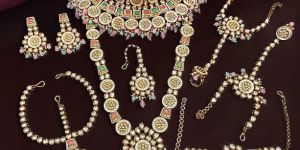 Set Includes : Two Necklaces, One Mathapatti, Pair of Earrings, Pair of Hath-phool, One Bindiya and Bajuband.