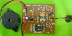 • Metal Detector detects the presence of metal by giving audible warning. This project indicates the presence of ferrous as well as non-ferrous materials depends on the absorption of magnetic energy. An inductor, which forms part of a tuned oscillator circuit, radiates a magnetic field. When a metal object is introduced into this field, enough magnetic energy is absorbed to cause the oscillator to stop working, which causes the output of IC1 high. Transistor T2 turns on and buzzer raises the alarm. IC1 is a Schmitt Trigger IC, which gives output according to the upper and lower threshold voltages set at input pin2 and pin3 respectively.About the Circuit :In the circuit diagram, L1 and C1 form an oscillator circuit operates at a frequency of about 70KHz. L1 also serves as a sensor. Because of the high value of resistor R1, the oscillator only just operates. This is desirable; otherwise any losses in the tuned circuit would easily be replenished by the transistor T1.When the metal object enters in the field induced by L1, the oscillator output is detuned. This output is rectified by diodes D1 and D2 and given to pin2 which is the upper threshold voltage of IC1.This voltage is below the lower threshold voltage at pin3, which is set by R7, R6 and P1. Hence the output at pin6 goes high and T2 turns on. Piezobuzzer connected at the collector of T2 sounds an alarm.Note : Inductor L1 is not intended to be fitted on the circuit board.Calibration : If the oscillator does not readily start at any setting of P1, the value of R1 must be reduced. If on the other hand, the oscillator does not stop working when a metal object is held near L1, the value of R1 must be increased. Starting with the wiper of P1 to earth, adjust the preset so that the buzzer just does not operate. If a lower sensitivity is required advance the wiper slightly further. Current consumption is determined primarily by whether the buzzer is energized or not, in any case it is not greater than 50mA.