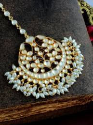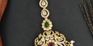 This exquisite maangtikka showcases a captivating floral design,crafted with intricate gold work and studded with shimmering gemstones. The centerpiece features a delicate floral motif adorned with pink and green stones,surrounded by pearl accents. Making it an ideal accessory for wedding and festive occasions. It would beautifully complement traditional attire, such as sarees or lehengas. adding a touch of regal allure to the overall look.