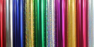 Holographic Patterns are created by way of an embossing process which can provide a remarkable Three Dimensional effect and/or spectral (rainbow) coloring. The embossing process is akin to cutting tiny grooves into the film’s surface at various angles and in different shapes. These micro-embossed grooves cause the “diffraction” of normal white light into stunning spectral color.